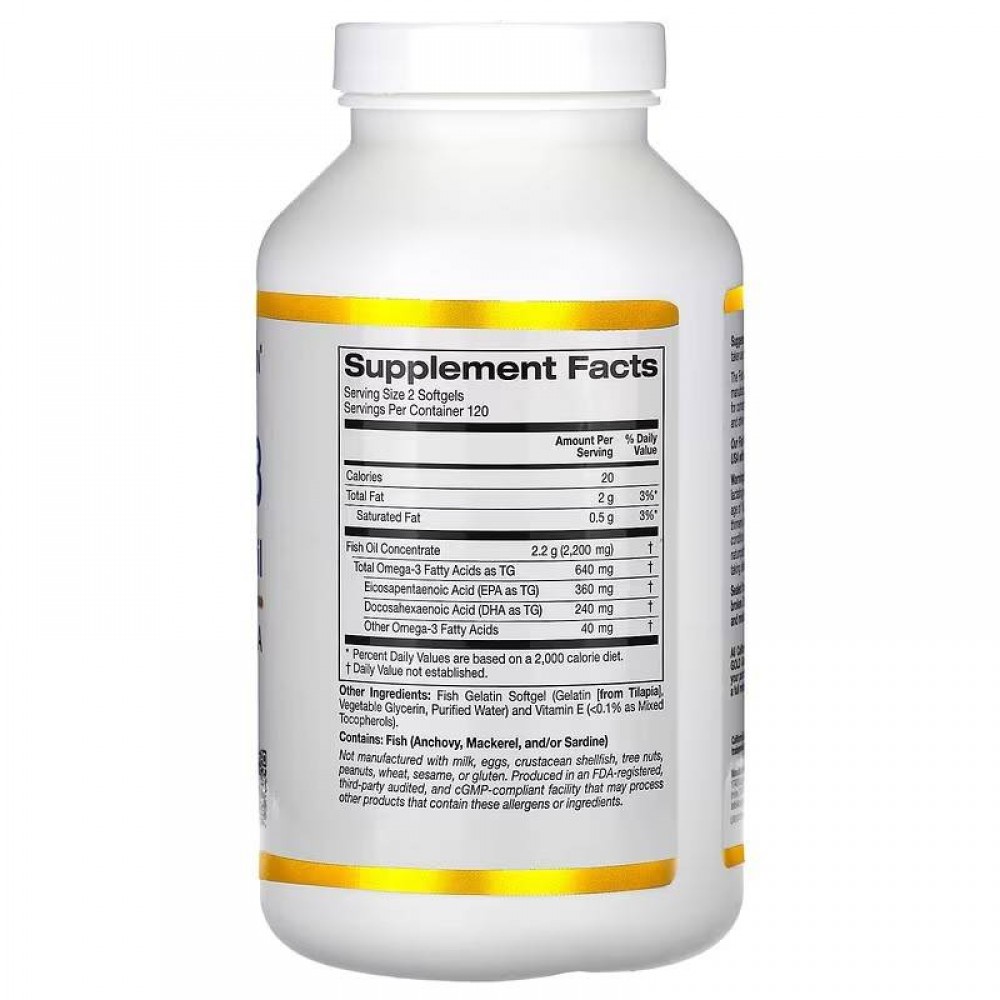 Рыбий жир омега-3 премиального качества от California Gold Nutrition — продукт молекулярной дистилляции, который содержит 180 мг ЭПК и 120 мг ДГК в одной капсуле из высокоочищенного и концентрированного натурального рыбьего жира от мировых производителей, соответствующий строгим стандартам контроля качества. Капсулы из рыбьего желатина не содержат свиных или бычьих ингредиентов и производятся в Калифорнии (США) из сырья от мировых производителей.